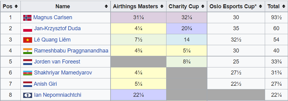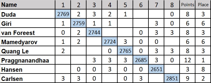 1.Прагнанандха - 12 ; 2. Карлсен - 9 ; 3-5. Дуда , Ле Куанг Льем, ван Форест - по 8 ;