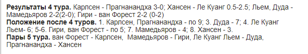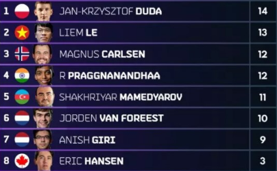 1-2. Прагнанандха ,Карлсен - по 12; 3-4. Дуда , Ле Куанг Льем - по 11 ; 5.;ван Форест - 9