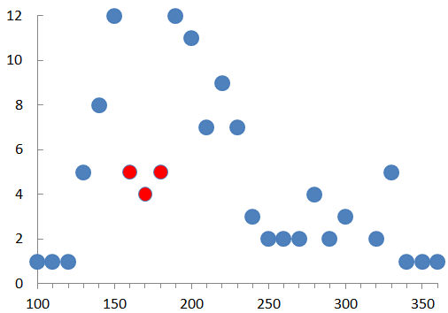 Да, если бы нынешний рейтинг Карлсена был не 2862, а пунктов на 15 поменьше, то и разница составляла бы "в основном" не 190, а вот эти 175. Любопытная вещь состоит в том, что из массива в 123 партии таких, где разница была бы в 160-170-180 пунктов на удивление мало - в сравнении с числом партий, сыгранных как при разнице в 150 пунктов, так и при разнице в 190-210.