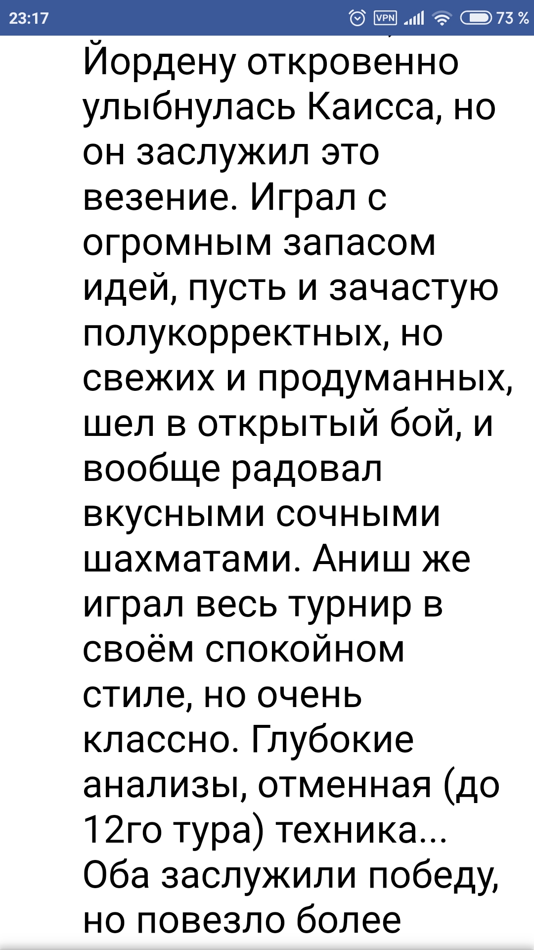 KoI: А я, наоборот, был бы рад видеть Гири победителем. Ну, просто пора, обидно за него - "по совокупности заслуг" давно наиграл на громкую победу в супертурнире. И репутация главного ничейщика всея шахмат у него поверхностная и незаслуженная. И если выиграет, порадует твитами.