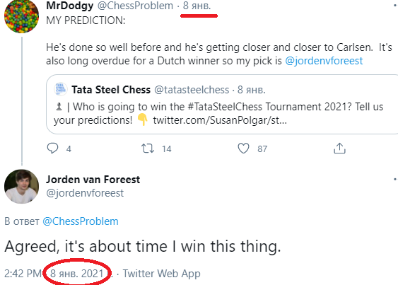 Любопытно, что по аутсайдерскому рейтингу вероятность победы ван Фореста оценивалась в 0,2% (https://chessnumbers.wordpress.com/2021/01/15/2021-tata-steel-masters-round-1-preview/).