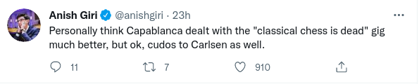 немного обидно читать подобный агрумент от Atle Grønn. ака Норвежец, если не ошибаюсь. можно подумать, что если была бы 6-часовая победа в 78 ходов, их бы не оторвать от экрана. тещу, чувака за камерой итд. а так скучновато выходит.