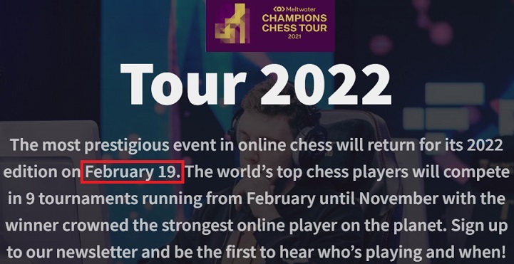 Jacob08: После успешных двух, третий сезон (девять турниров) начинается 19 февраля 2022. И дополнительно, чтобы успокоить параноиков), заключена договорённость о ещё четырёх годовых сезонах Meltwater Champions Chess Tour вплоть до 2026 года.