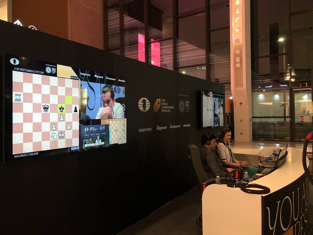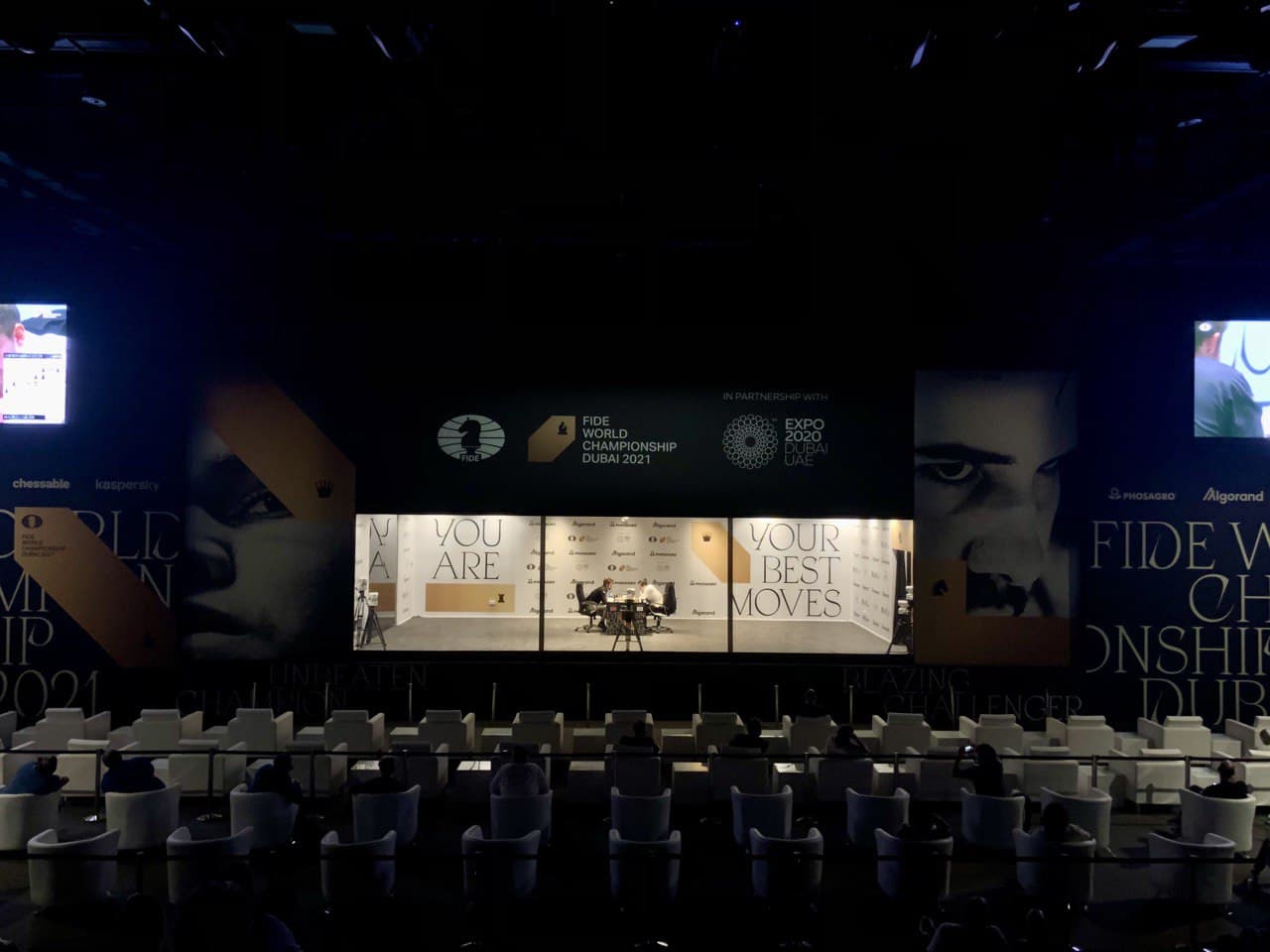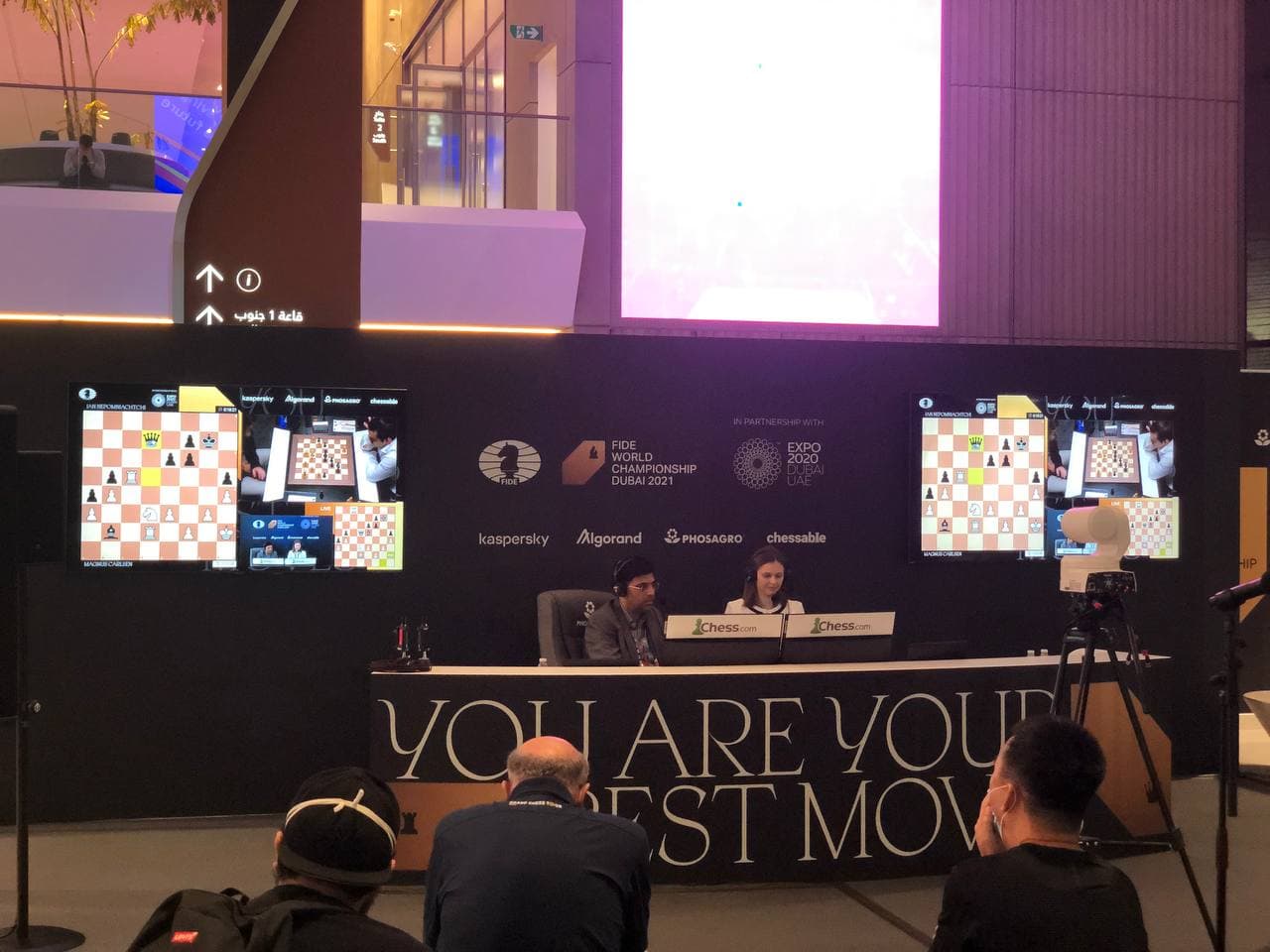 Слева кабинки для прессы и зрительный зал, где события матча комментируют Виши Ананд и Анна Музычук.