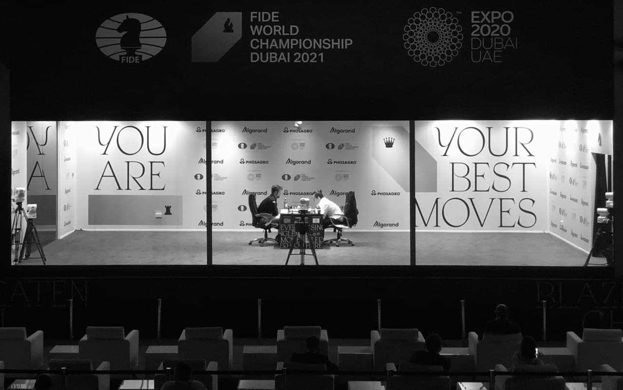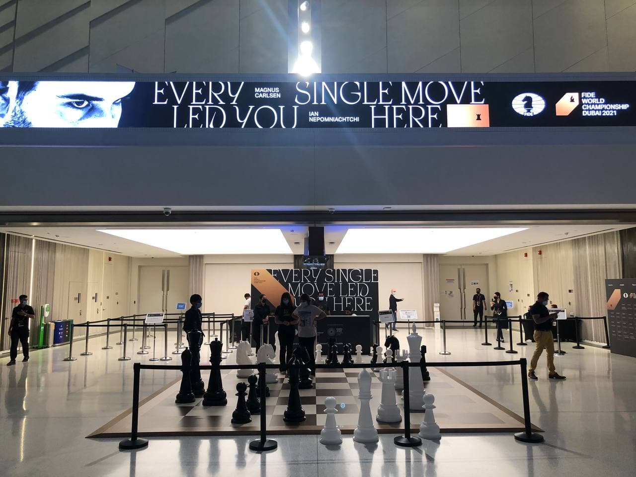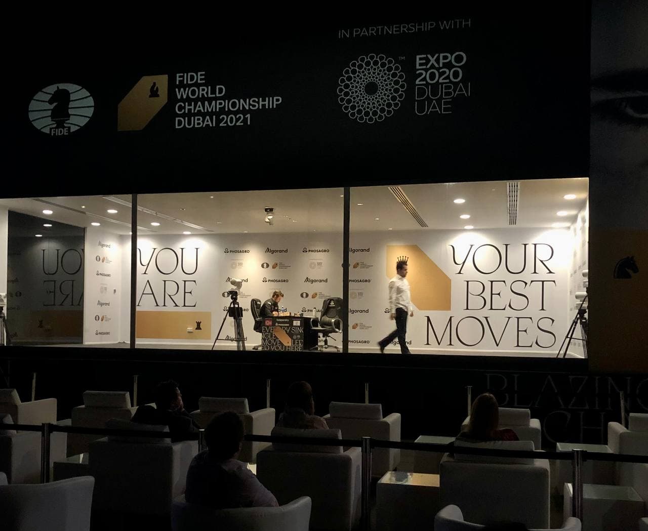 Слева кабинки для прессы и зрительный зал, где события матча комментируют Виши Ананд и Анна Музычук.