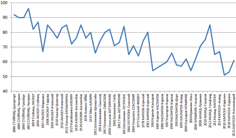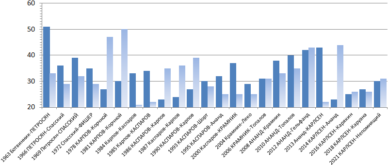 Перед матчем-2016 я, оказывается, состряпал диаграммку (из двух частей) с возрастом соперников во всех 45-ти (тогда) матчах на первенство мира. Вторую часть пора "осовременить"