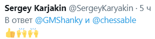 Узнав об этом, Сергей ответил Сэму твитом без слов, но с поднятыми руками