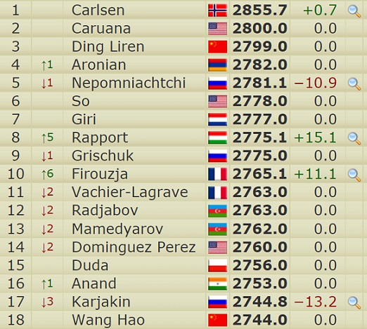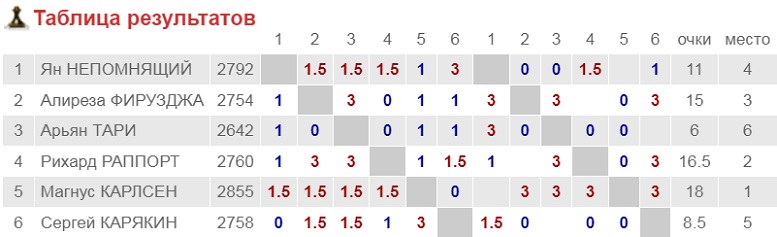 1. Карлсен - 18 (6) 2.Раппорт - 16.5(6) 3. Фирузджа -15(5,5) 4.Непомнящий - 11 (4) 5. Карякин - 8.5 (3) 6. Тари - 6(2,5) |