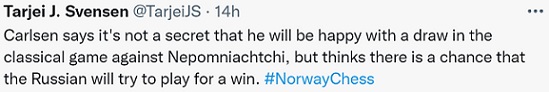 Однодворец: Как-то сомнительно, чтобы Карслен пошел на ухудшение позиции с Карякиным, которому чуть матч не проиграл, а здесь первую партию вообще слил. Вроде он старается всегда просто переиграть. Но это имхо, может старшие мастера поправят.