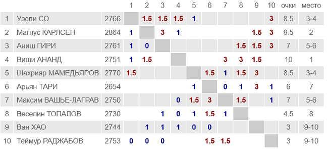 Магнус Карлсен выиграл 3-ю классическую партию , пересек отметку 2870 в живом рейтинге и стал единоличным лидером