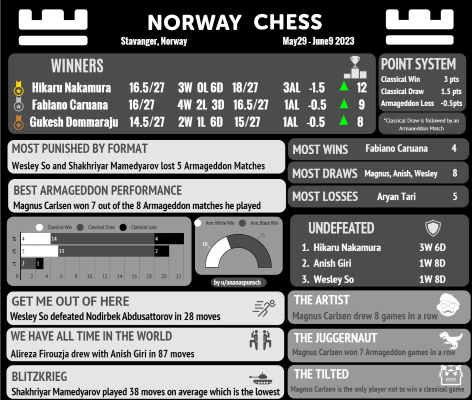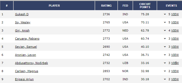 Итоги. 1. Накамура - 16.5; 2. Каруана - 16; 3. Гукеш - 14.5; 4. Гири - 13; 5. Со - 12.5; 6. Карлсен - 11.5; 7. Мамедьяров - 11; 8. Фирузджа - 10.5; 9. Абдусатторов - 9; 10. Тари - 6 |