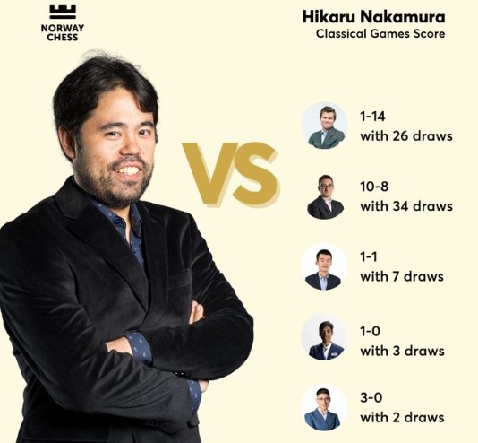 | Magnus Carlsen has a positive score of 14-1 with 26 draws against Hikaru Nakamura in classical chess, and 96 to 56 with 113 draws in rapid chess! |