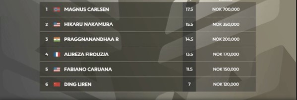 Карлсен о турнире в целом: "Хорошее, но отнюдь не блестящее выступление. Я действовал профессионально в последних семи партиях". Карлсен был недоволен своим поражением от Праггнанандхи в третьем туре, но победа над Каруаной в четвертом позволила ему вернуться на первое место и успешно добраться до финиша.