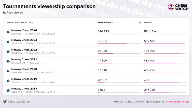 Coming to viewership comparisons, Norway Chess 2024 ended second on the most watched and most popular by PV tables for the year. Leading the charge is the FIDE Candidates Chess Tournaments 2024, which closed as the sport's third-most watched competition of all time and its fifth-most popular one ever.