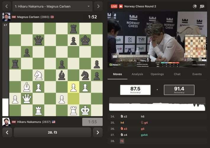 Накамура: «Я думал, что все в порядке... а потом возникла ситуация, когда середина игры была очень сложной в течение нескольких ходов. Я на самом деле очень гордился тем, как я начал использовать свое время, просто делая быстрые ходы, потому что в противном случае я бы просто проиграл по времени... Это была хорошая игра!»
