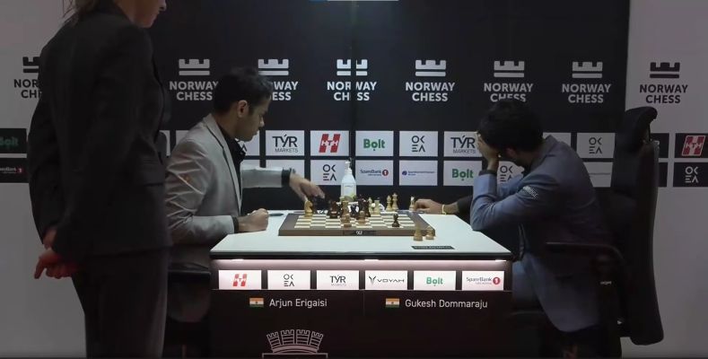 показал супруге момент когда Эригайси смотрит расслабленно вдаль а Гукеш склонился над доской в напряжении и спрашиваю