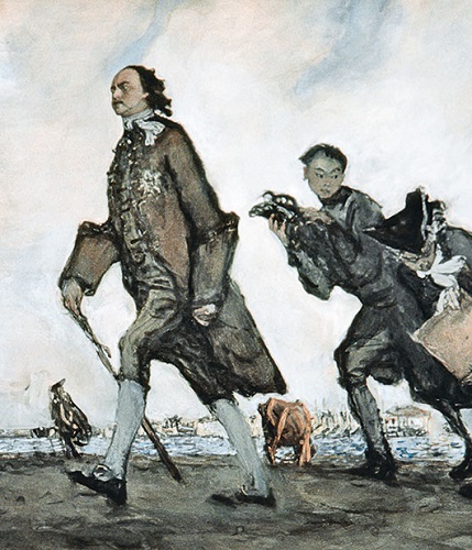 Петр не может долго оставаться на месте, он все время в движении: вечно куда то спешит, наскоро и неряшливо ест, при ходьбе быстро перебирает своими журавлиными ногами, так что свита сзади вынуждена нестись вприпрыжку. Так же быстро он и ездил – гнал лошадей во весь дух, часто без остановок, даже спал в санях или в коляске. Ему, кажется, было невтерпеж долго оставаться на одном месте. Пишут, что и во время застолья он постоянно вскакивал, выбегал из помещения, потом возвращался.