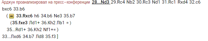 Продвижение пешки — не лучший ход в позиции, но он ведет к дальнейшим упрощениям, закрепляющим преимущество черных. Помимо того, что Нихал остался в последующей борьбе с лишней пешкой, еще у него была лучшая пешечная структура (учитывая сдвоенные пешки белых по линии "f"). Сетураман сдался на 57-м ходу.