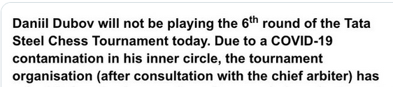 Роберт Монс, пресс-секретарь Tata Steel, дал комментарии Chess.com: "Этот сценарий не обсуждался заранее, но в контракте участника есть положение, согласно которому организаторы могут принять нужные меры возникновении неожиданных ситуаций, связанных с КОВИД. Врач, находящийся на турнире, счел, что Дубову опасно играть без маски, поэтому мы как организаторы попросили Дубова, который понял наше решение, но предпочел не играть из принципа. Мы не рассматривали возможность перенести партию, потому что Дубов мог сегодня играть, хотя и в маске. Он сам решил не играть".