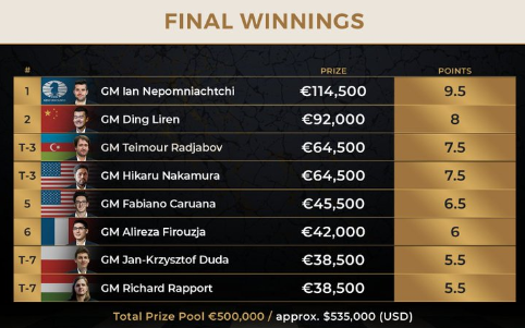 Итоги. 1. Непомнящий - 9.5; 2. Дин Лижэнь - 8; 3-4. Раджабов, Накамура - по 7.5; 5. Каруана - 6.5; 6. Фирузджа - 6; 7-8. Дуда, Раппорт - по 5.5 |