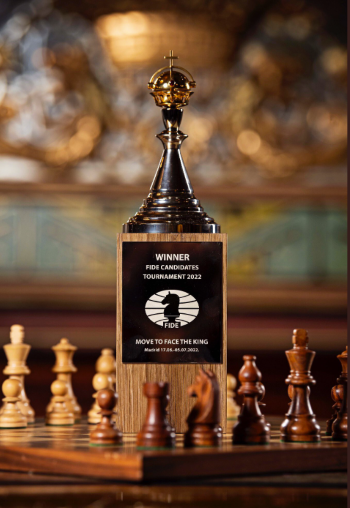 Король как шахматная фигура, позолоченная корона как вершина достижений, дуб как символ силы и долговечности. Это трофей FIDECandidates 2022 года , созданный Армандсом Екабсоном. |