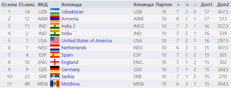 В меню последнего дня Узбекистан (17) - Испания (15) и Армения (17) - Нидерланды (15). Или наоборот.