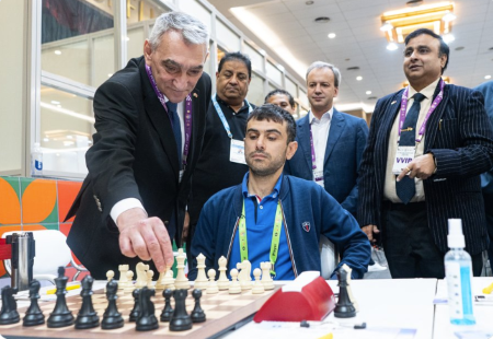 Посол Армении в Индии Юрий Бабаханян делает первый ход для гроссмейстера Габриэля Саркисяна.
