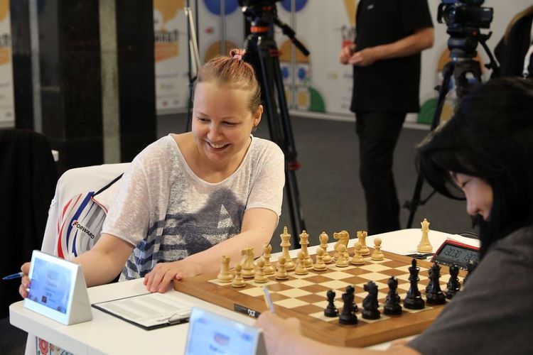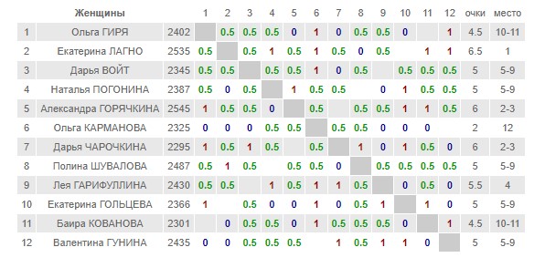 Второе-третье места поделили Дарья Чарочкина и Александра Горячкина, набравшие по 6,5 очков. Лучшие дополнительные показатели вывели Чарочкину на второе место.