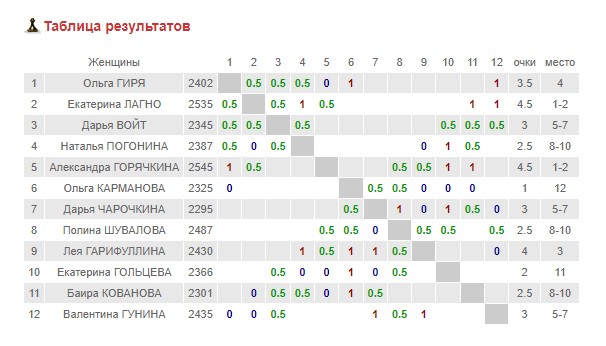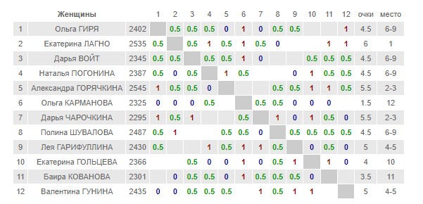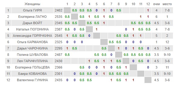 В женском чемпионате Екатерина Лагно черным цветом переиграла Ольгу Карманову и стала единоличным лидером турнира, поскольку ее основная конкурентка Александра Горячкина сыграла вничью с Дарьей Войт.