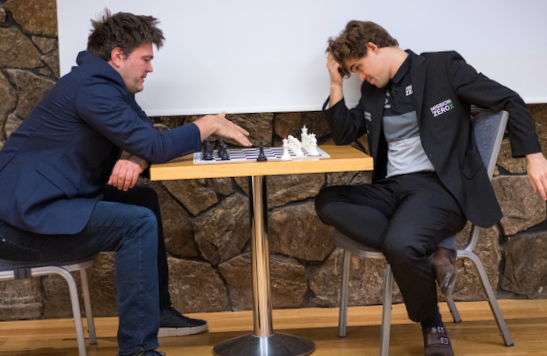 | Magnus Carlsen: "I feel like every day I've played pretty well in the first match & then kind of poorly in the other — today was no exception. The last couple of games were really bad, but I managed to save them, & now at least I win the group, which is nice!" |