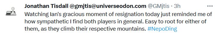 | I hope the intensity and beauty of this #chess World Championship will remind people that classical chess is quite often far more watchable and exciting than blitz or rapid chess. A chess boom combined with a lack of classical events does not make sense. |
