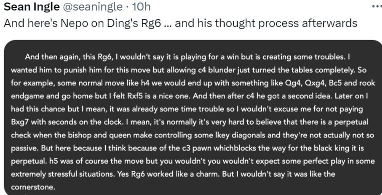 - Games 9-14 where Nepo felt he was much stronger but Ding clung on