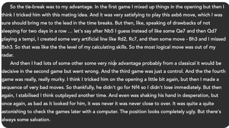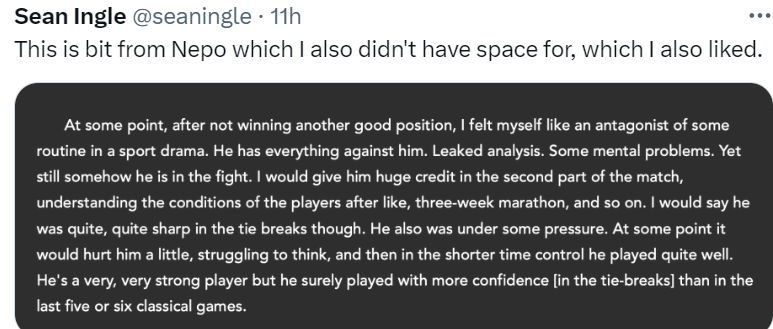 После матча с Магнусом было интервью, где Ян сказал, что-то вроде того, что нервы там были ни при чём. И я вроде написал тогда, что раз проблема не признаётся, то и не решится. |