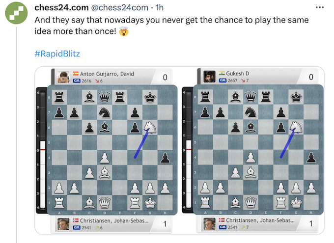In round 11, Daniil Dubov was playing as White against Ian Nepomniachtchi. The game lasted 13 moves: 1.Nf3 Nf6 2.Nd4 Nd5 3.Nb3 Nb6 4.Nc3 Nc6 5.Ne4 Ne5 6.Ng5 Ng4 7.Nf3 Nf6 8.Ng1 Ng8 9.Nc5 Nc4 10.Na4 Na5 11.Nc3 Nc6 12.Nb1 Nb8 13.Nf3, and they agreed a draw.