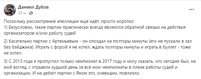3) сегодня был, на мой взгляд, с отрывом худший день за все мои чемпионаты в плане работы судей и организации. И на дебют партии с Яном это, очевидно, повлияло.