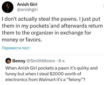 Можно легко от таких дел Гири отвадить - на следующую партию вместо украденной фигуры поставить жвачку.