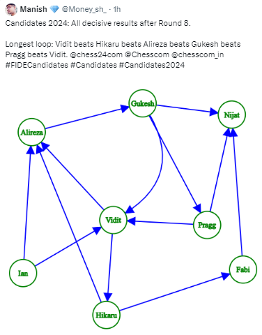 Положение после 8 туров. 1-2. Непомнящий, Гукеш – по 5; 3-4. Накамура, Прагнанандха – по 4,5; 5. Каруана – 4; 6. Видит – 3,5; 7. Фирузджа – 3; 8. Абасов – 2,5.