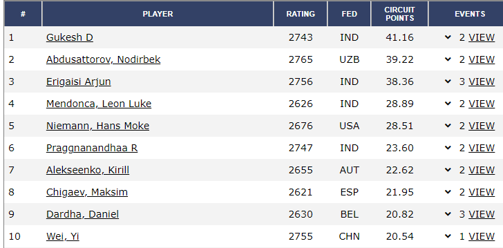 Прекрасно понимаю, что о ФИДЕ-туре сейчас никто не вспоминает. Тем не менее: победа в ТП принесла Гукешу временное лидерство в Туре-2024. За Вейк они с Абдусатторовым получили очков поровну, а первое место в ТП оказалось на 2 балла "дороже" первого места в Прага Мастерс.