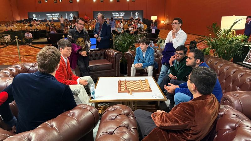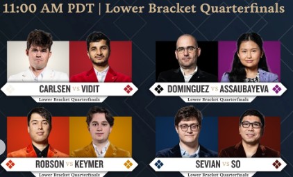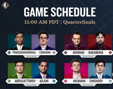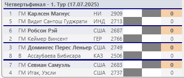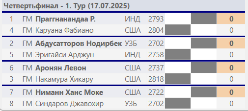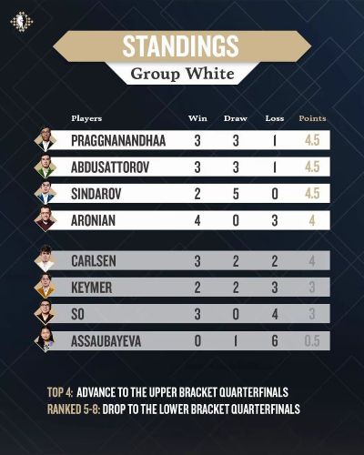 Опередив Карлсена и Ароняна, три игрока в белой группе набрали по 4,5 очка: Праггнананда, Абдусатторов и Синдаров. Двое последних, соотечественники, посчастливилось встретиться друг с другом в финальном раунде, где ничья означала бы выход в финал для обоих. Предложение ничьей до 40-го хода не допускается, и в фристайле не так-то просто свести партию к ничьей, но двум узбекским шахматистам это удалось без труда.