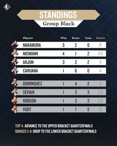 Ниманн, прошедший отбор во время онлайн-отборочных игр в свой день рождения четыре недели назад, произвёл отличное впечатление в свой первый день в Лас-Вегасе. Благодаря отличному тайм-менеджменту и мощной игре он плавно дошёл до 4,5/5, но затем проиграл два последних раунда своим соотечественникам Каруане и Накамуре, что, впрочем, не имело значения. Он был явно в отличной форме.