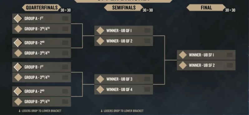 В верхней сетке игрок, занявший первое место в каждой группе, выберет себе соперника из числа игроков, занявших третье и четвертое места в другой группе, а игрок, занявший второе место, автоматически сыграет с невыбранным игроком.