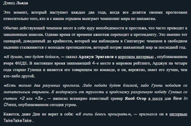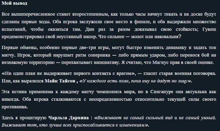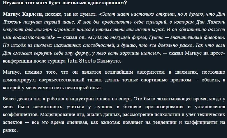 — Все предрекают победу Гукеша, вероятно, разгромную, но давайте вернемся всего на год назад. В турнире Гранд Свисс, сильнейшем опене года, индус обретался в нижней половине таблицы, проигрывал, пытался отыграться, эмоционально, по-юношески, снова проигрывал, и лишь к финишу как-то стабилизировался. На турнире в Лондоне в декабре — похожая картина. Неровное качество, пробелы в игре (у кого их нет в 17 лет!), много желания. И потом неожиданный успех. Как и в случае Дина — в турнире на родине, организованном специально для него и Эригаиси в последний момент. Победа в нем принесла Гукешу место в турнире претендентов через FIDE Circuit, шахматный аналог теннисного тура (со своей спецификой, как видим). На турнире претендентов в Торонто Гукеша было не узнать — спокойный, уверенный в себе юный дебютант. Оксюморон!