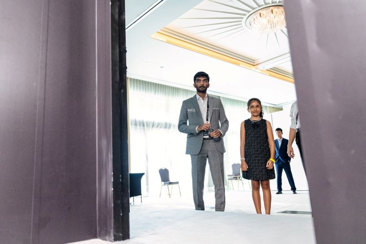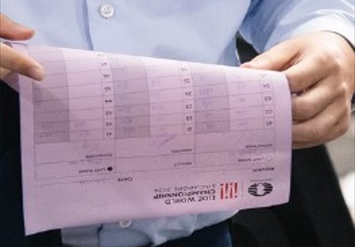Я предположил, что на фото у них в руках другие бланки, не те, что они заполняли, так как на столе видны еще два листа, а партия, судя по королям в центре доски, окончена. И что было бы так внимательно одновременно читать на незаполненных бланках?