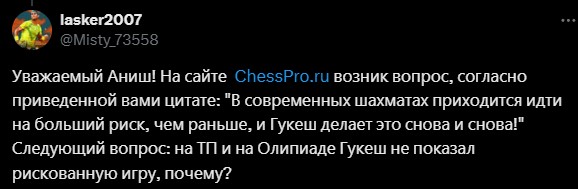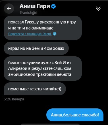Evgeny Gleizerov: Совершенно согласен, я сам объясняю точно так же, в том числе в предисловии к сегодняшней партии, подчёркивая, что ни в чём Дина не упрекаю. .