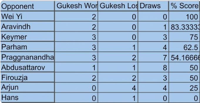 | Gukesh's Head to Head Score against the young players in classical chess |