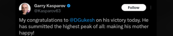Congratulations to Gukesh D on his remarkable accomplishment. This is the result of his unparalleled talent, hard work and unwavering determination.
