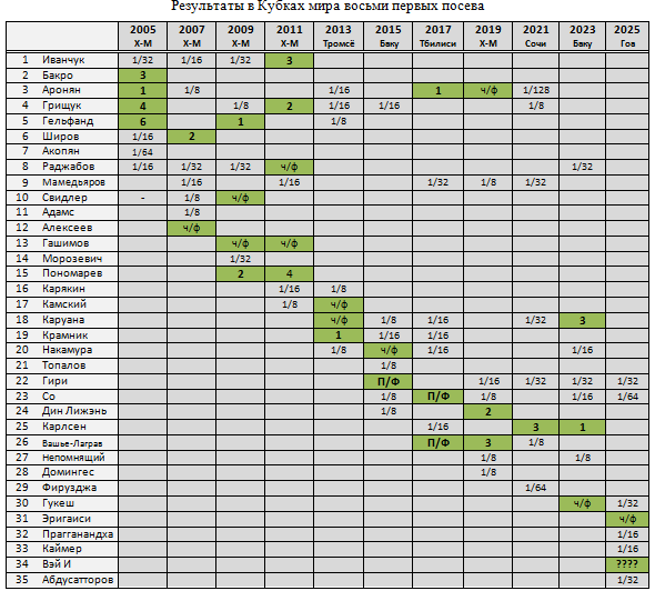 Следующую таблицу я, наверное, приводил (в подтверждение уверенного прогноза: из первых Топ-8 до "положенного им" четвертьфинала дойдут не более трёх). Добавил лишь "актуальный" столбец про текущий Кубок мира.