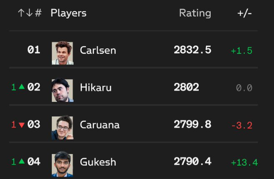Текущий рейтинг Гукеша в реальном времени составляет 2790,4, что позволяет ему как достичь отметки 2800, так и превзойти свой предыдущий пиковый рейтинг в 2794. Сегодня будет за что побороться!