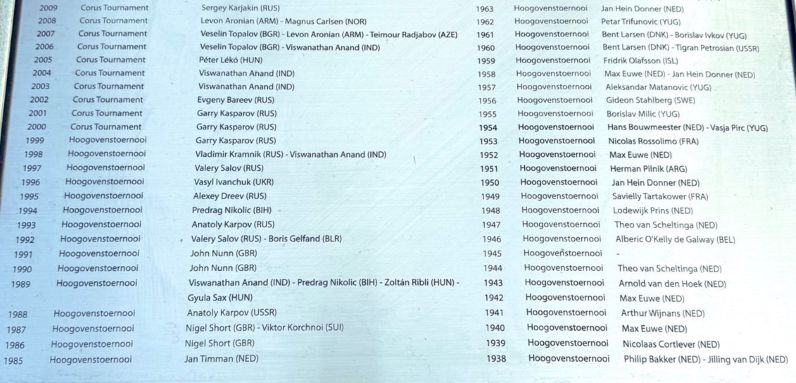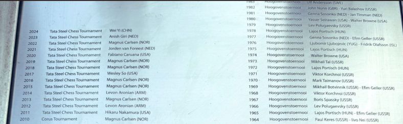 Hier een overzicht van alle winnaars van @tatasteelchess, inclusief Hoogovens en Corus schaaktoernooi. In 1945 geen winnaar (niet gespeeld ivm WO II). Magnus Carlsen was zevenmaal winnaar.