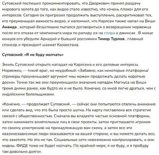 Одна из главных претензий к ФИДЕ, что они не смогли защитить членов своей организации. Речь прежде всего о главном арбитре и FIDE technical delegate. Не представляю, чтобы нападки на судью в паблике от выдающихся спортсменов в других видах спорта остались бы не только безнаказанными, но и массово одобрялись бы «любителями».